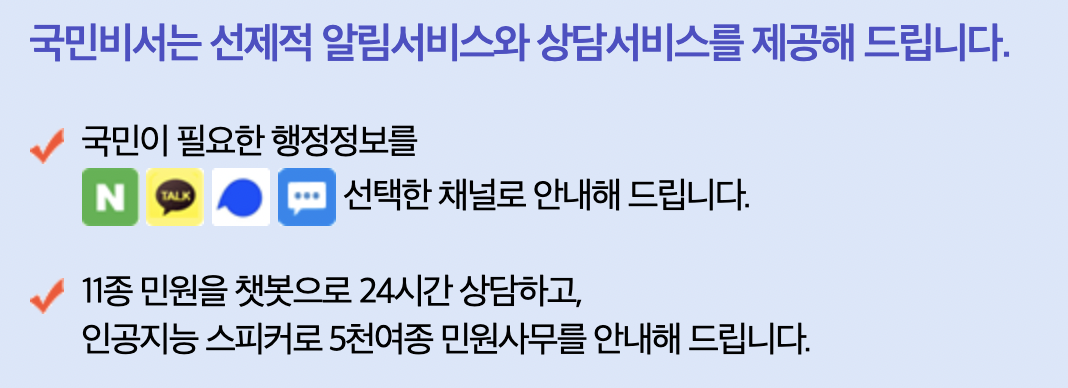 국민비서는 국민들에게 선제적 알림서비스를 제공하고 상담서비스를 제공합니다. 국민지원금 대상여부, 지급신청 등 안내 뿐만아니라 운전면허 적성검사, 운전자교육이나 교통 범칙금이나 과태료도 카톡으로 알림을 받을 수 있습니다.
