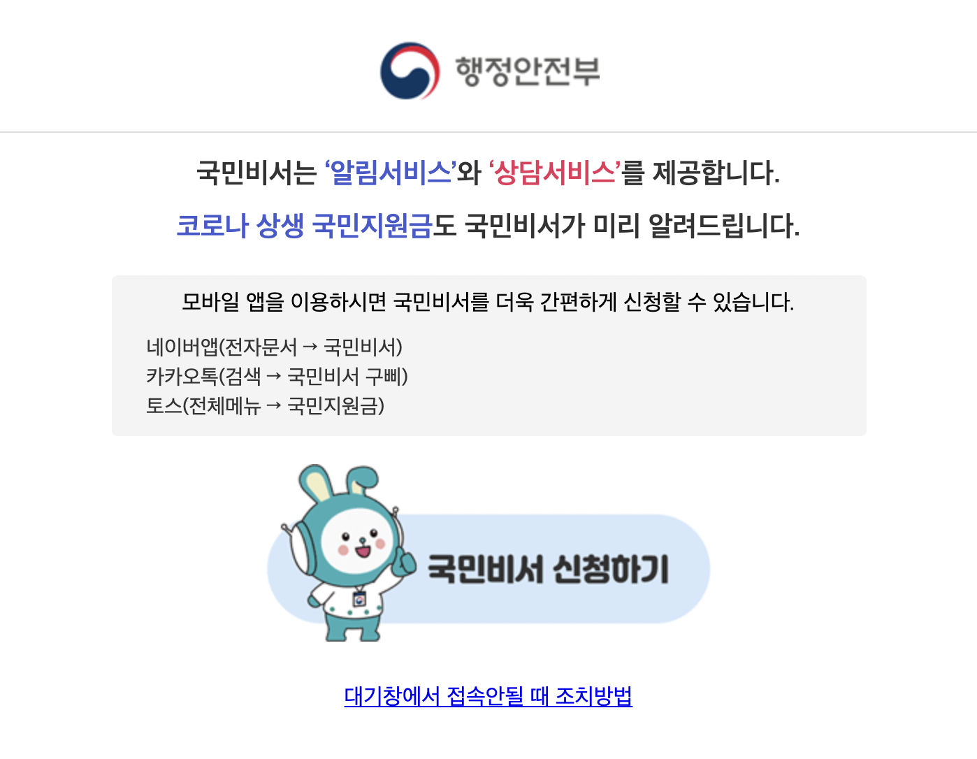 위의 링크를 클릭하여 국민비서 신청하기 버튼을 눌러 카카오톡 간편인증을 통해 쉽게 가입할 수 있습니다.