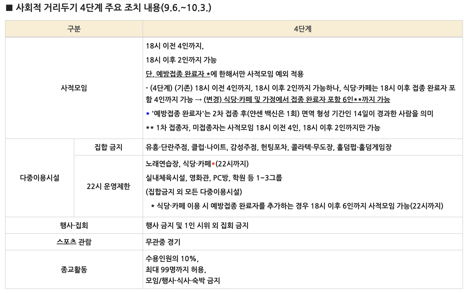 • (기존) 18시 이전 4인까지, 18시 이후 2인까지 가능, 식당·카페는 18시 이후 접종 완료자 포함 4인까지 가능