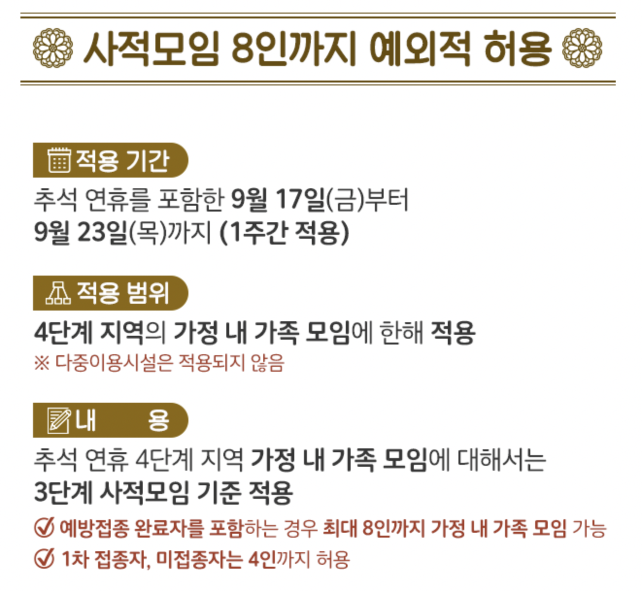 추석 연휴를 포함한 1주간(9.17~23) 동안 직계가족의 가정 내 모임에 대해 접종 완료자 포함하여 8인까지 모임을 허용합니다. 가정 내 모임에 한해 8인까지 모임이 허용되는 것이므로 다중이용시설 이용 시에는 적용되지 않습니다.