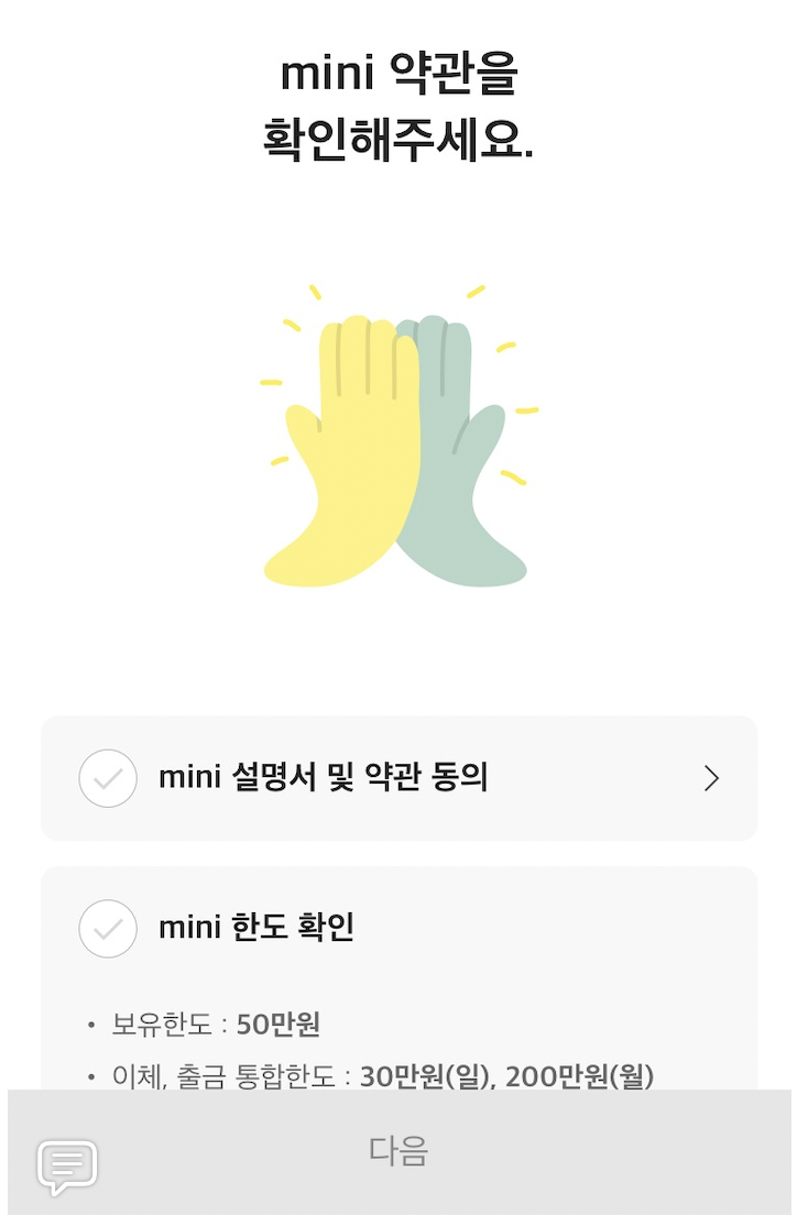 위의 링크를 통해 카카오뱅크앱을 설치한 후에 카카오뱅크 mini 계좌를 만듭니다.