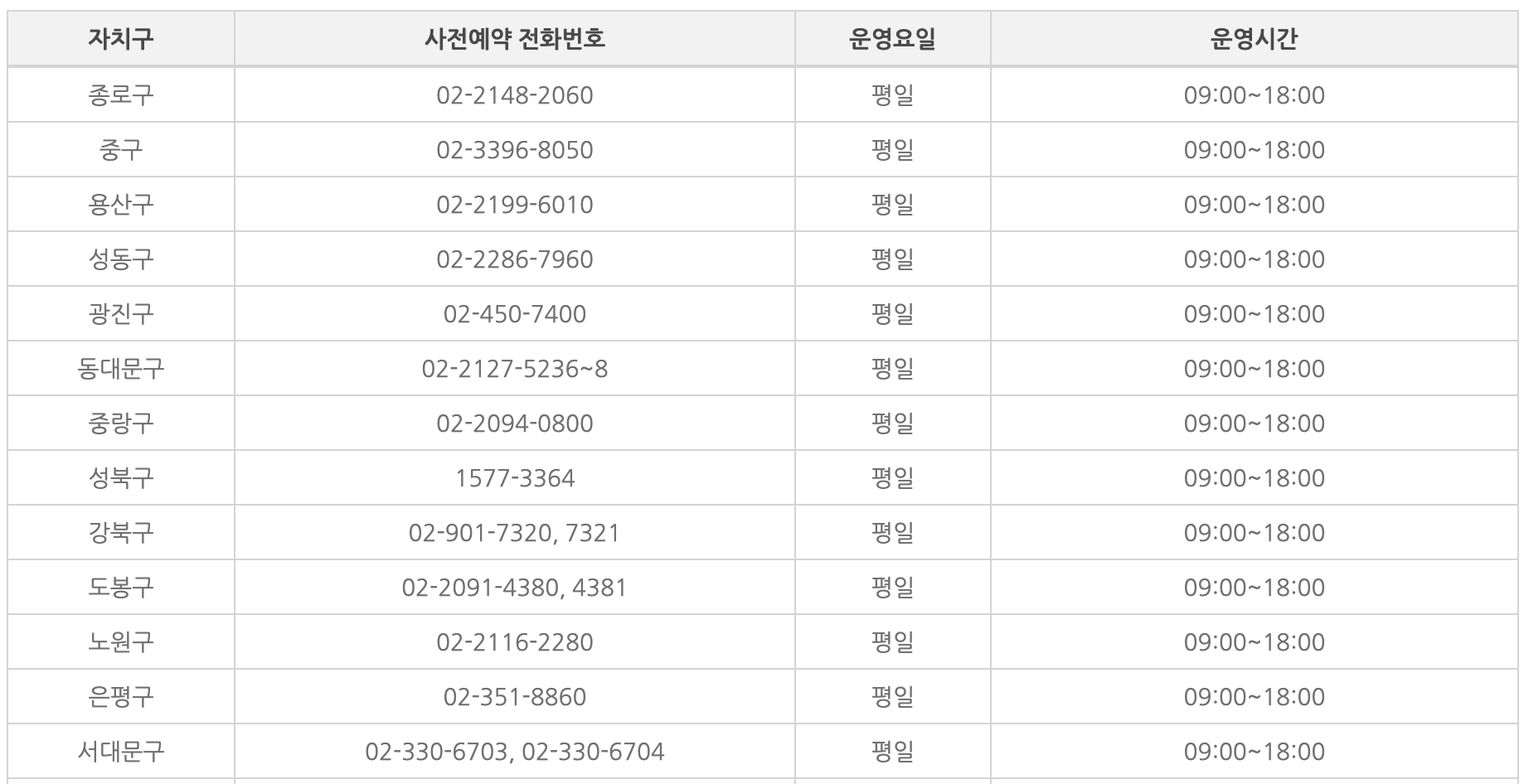 각 구별로 예방접종관련 콜센터 전화번호를 확인하여 문의를 하면 친절하게 응대해줍니다.
