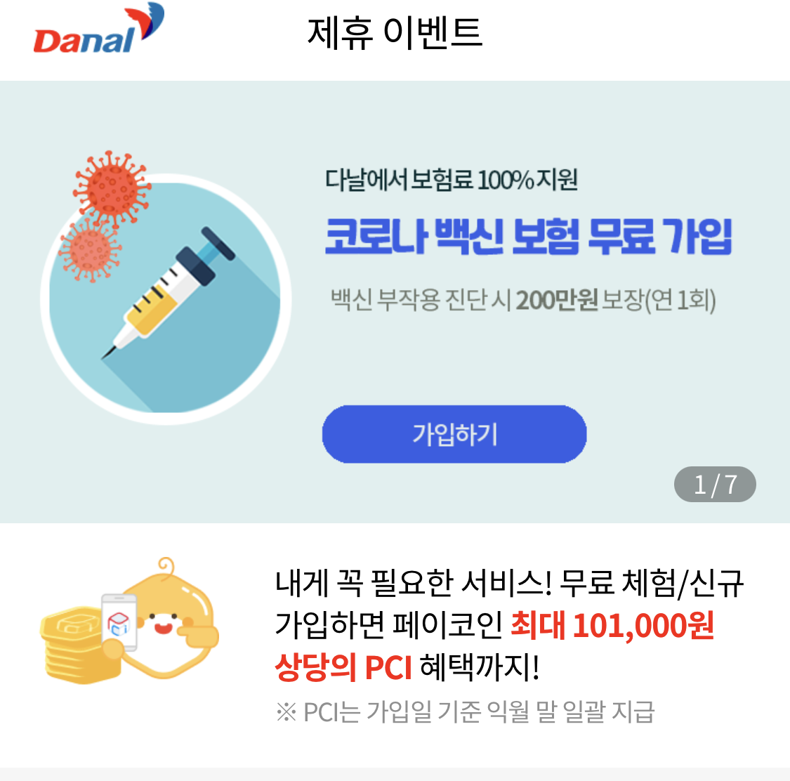 신규 가입자에 한해서 코로나 백신 부작용 진단 시 200만원까지 보장하는 이벤트도 하고 있네요.