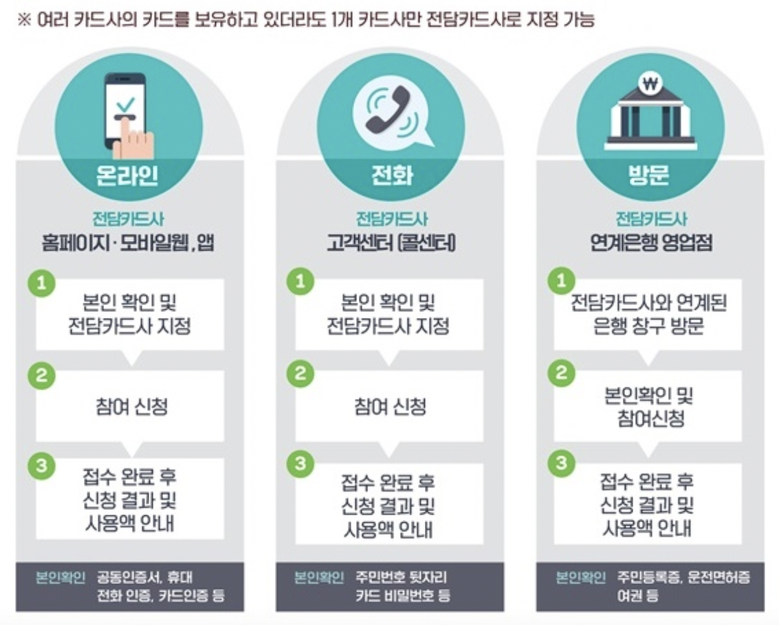 - 지급방식: 신청기간 중 전담카드사를 지정, 지정한 카드사로 지원금(포인트)을 지급