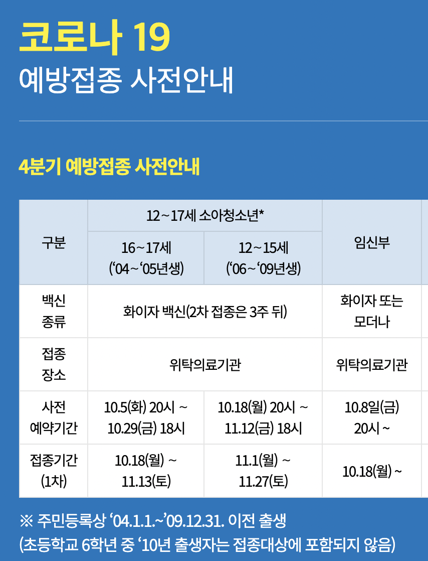 접종 예약 기간은 10월 18일 월요일부터 11월 12일 금요일까지 입니다. 역시 성인과 동일한 화이자를 동일한 용량만큼 접종합니다.