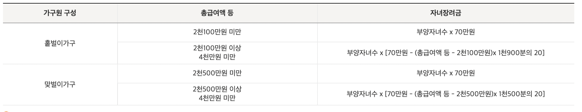 그리고 자녀가 있다면 부양자녀당 50만 원~70만 원까지 지원합니다.