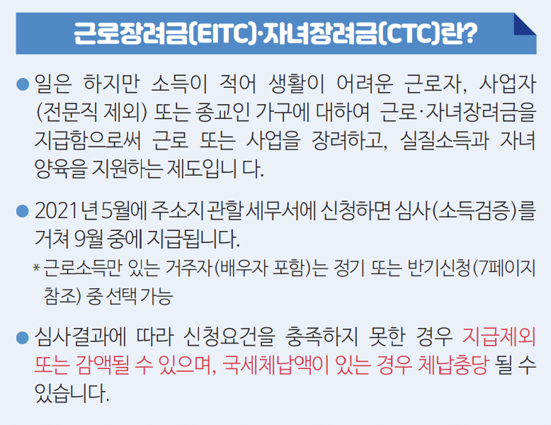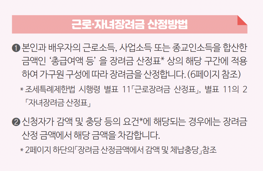 전년도에 근로소득, 사업소득 및 종교인 소득이 있고, 근로장려금과 자녀장려금 신청요건을 모두 충족하는 가구가 매년 5월 주소지 관할 세무서에 신청하면 총 급여액 등에 따라서 산정된 근로장려금과 부양자녀 수에 따라 산정된 자녀장려금을 지급합니다.
