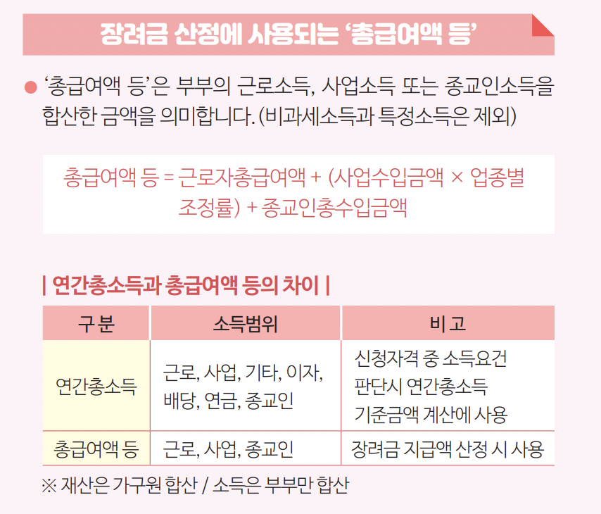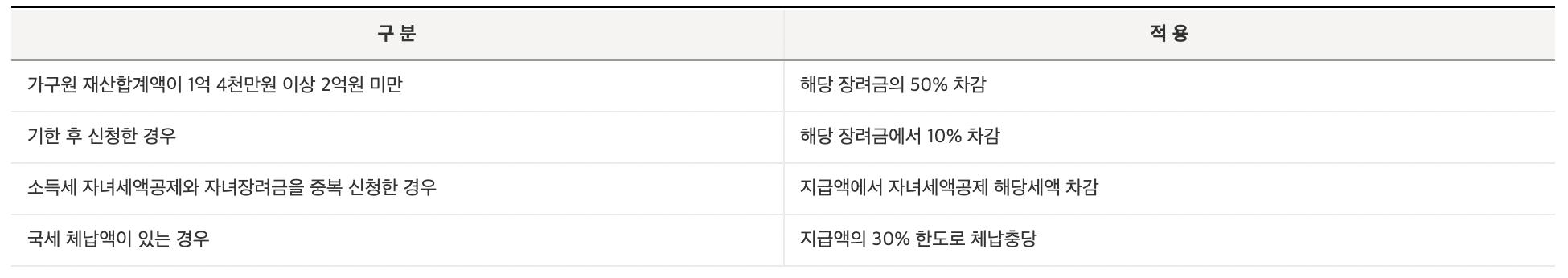 여기에 자녀장려금을 받기 위해서는 전년도 부부합산 소득이 4천만 원 이하여야 합니다. 근로장려금을 받지 못해도 자녀장려금을 받을 수도 있으니 이런 조건을 잘 챙겨봐야 하겠습니다.