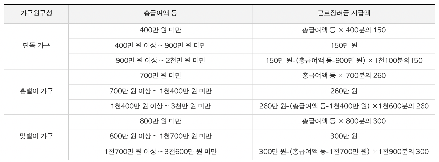 가구원 구성에 따른 총급여액 별 근로장려금 지급액(출처 : 국세청 홈페이지)