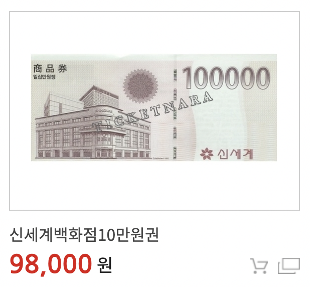 신세계상품권은 보통 티켓나라에서 구매할 경우 2~3% 할인이 보통입니다. 10만 원짜리 상품권을 구매할 경우 9만 7천 원~9만 8천 원에 구매가 가능합니다.