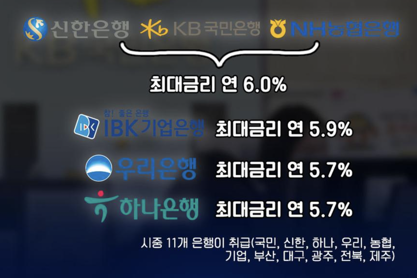 가입할 수 있는 은행은 총 11개 곳입니다. 은행 11곳은 공통적으로 연 5%의 기본 금리와 0.5~1% 포인트의 우대 금리를 줍니다.