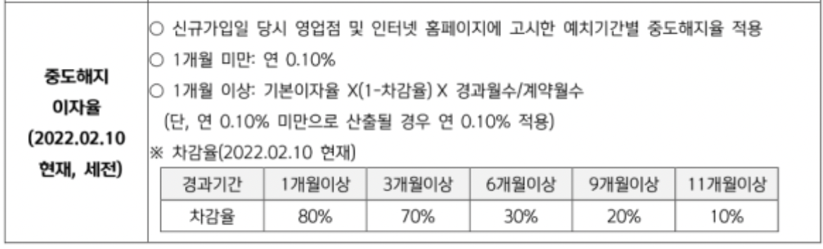 혹시 중도 해지 한다면 아래의 조건을 잘 확인하시기 바랍니다. 아래의 내용 역시 신한은행의 내용이고, 은행마다 상이할 수 있으니 해당 은행에 문의를 해보시기를 권합니다.