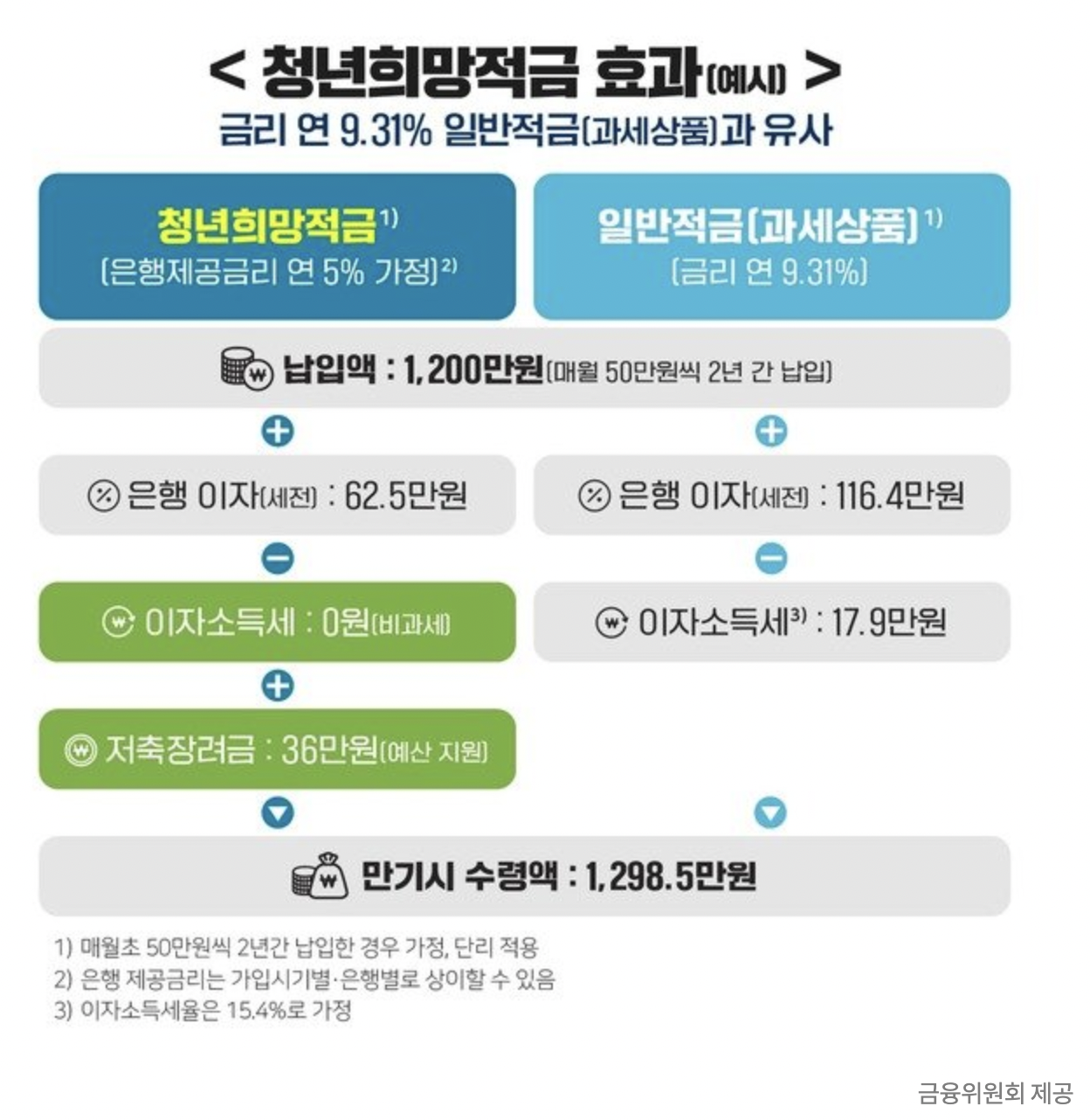 아래 금융위원회에서 제공한 자료에 따르면 매년 1,200만 원씩 납부하면 1,298만 원을 받을 수 있다고 하니 이는 연 9.31% 일반 적금 상품과 유사한 상품입니다.