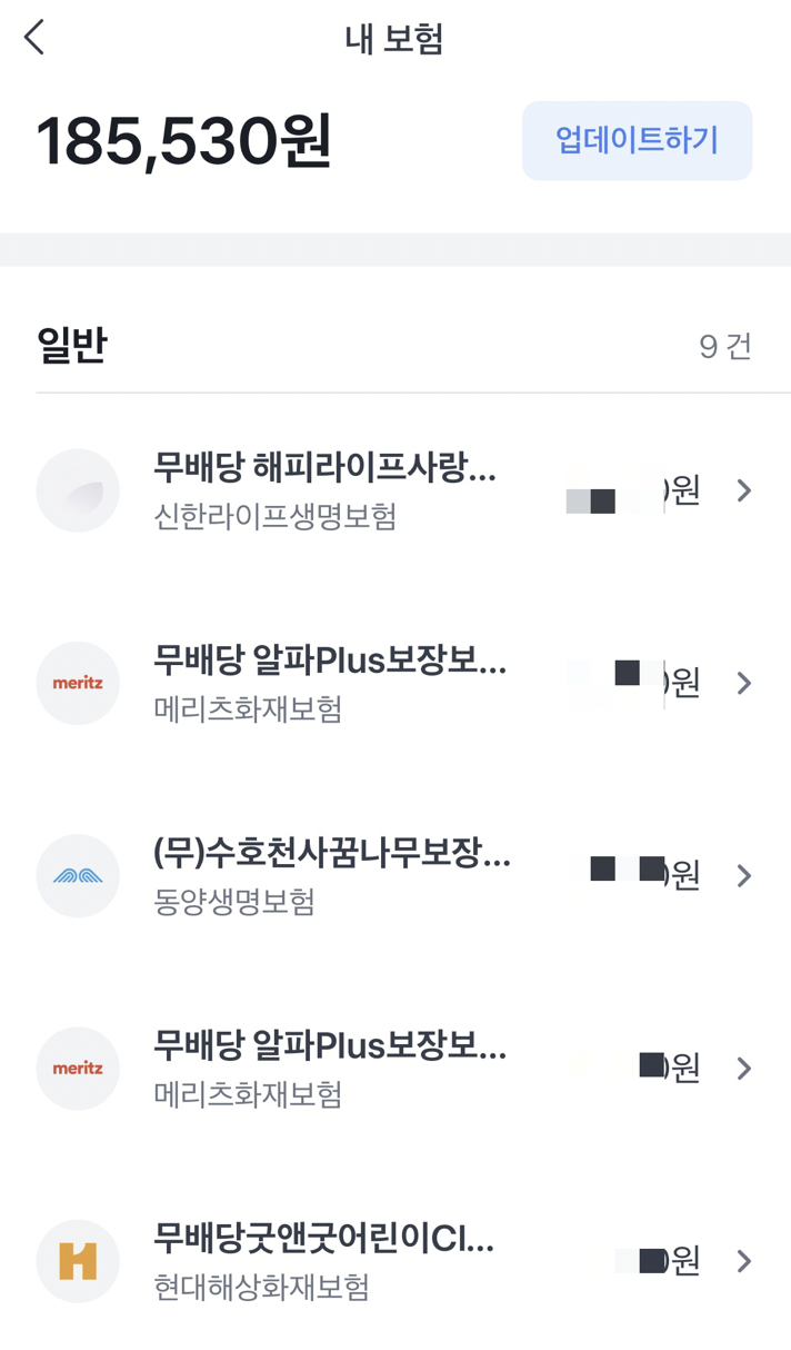 보통 의료실비보험, 자동차보험, 운전자 보험, 암보험, 종신보험 등이 있는데, 토스 앱 통해서 보험 전체 가입내역을 살펴보니 아래와 같았습니다.