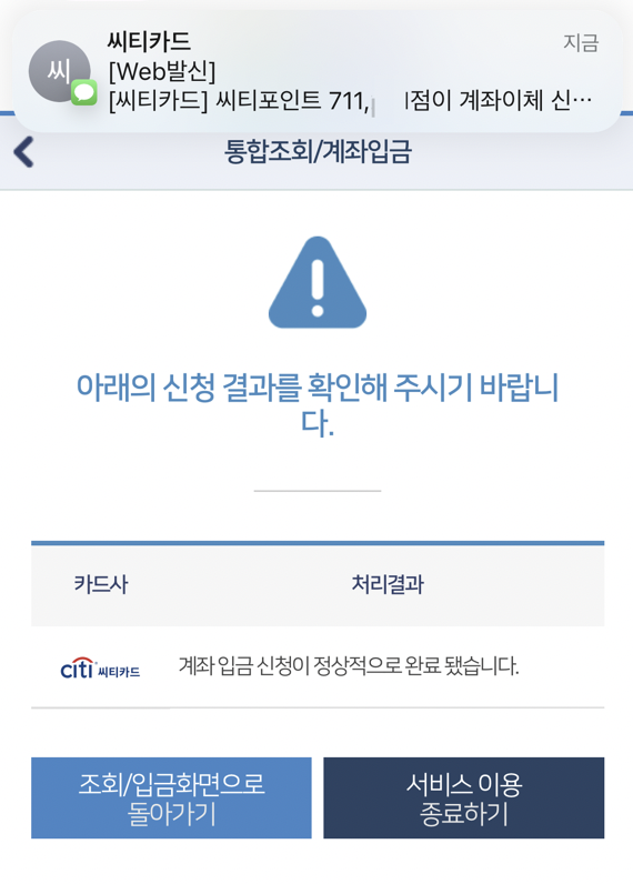 차곡차곡 쌓아둔 씨티포인트가 계좌 입금이 된다. 이런 게 있었는지 몰랐다가 씨티카드사에서 문자가 와서 해본 후기이다.
