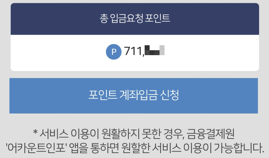 여기에서 포인트 계좌 입금 신청을 하고 나면 아래와 같이 내 명의의 계좌를 입금할 수 있는 창이 나온다.
