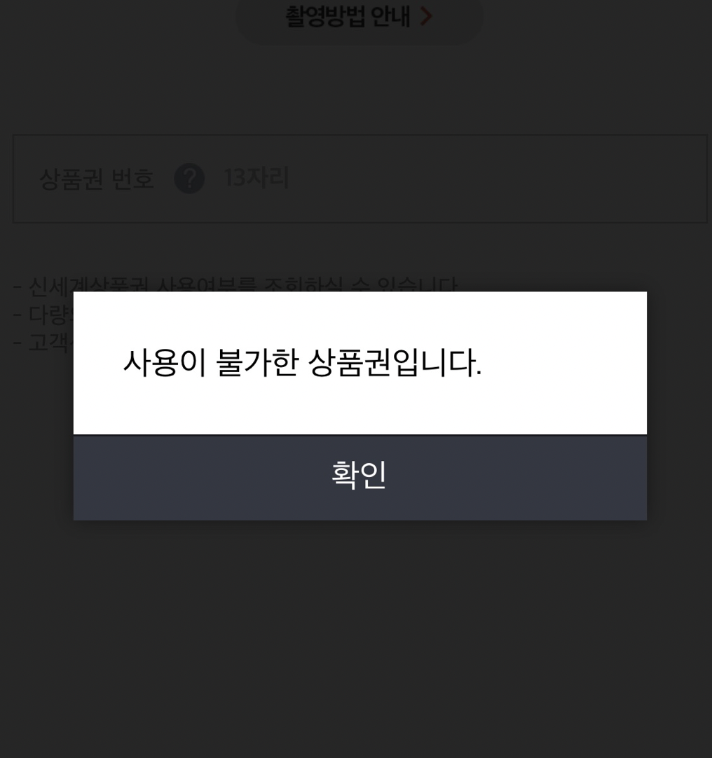 확인 버튼을 누르고 아래와 같이 상품권 뒷면의 바코드를 화면에 위치시키면 된다.