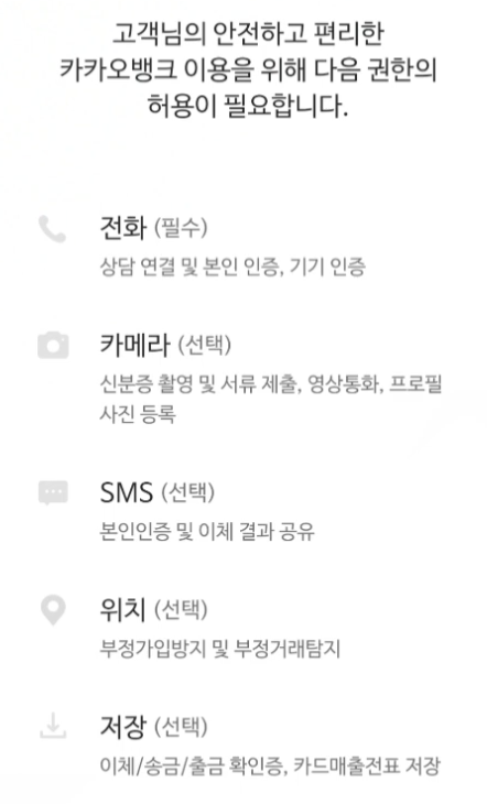 카카오뱅크를 이용하기 위해 어떤 정보를 이용하는지에 대한 내용입니다.