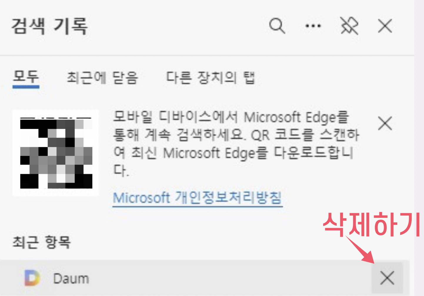 검색기록에 나온 내용을 삭제하는 방법은 접속한 히스토리 우측에 있는 X 표시를 누르면 됩니다.