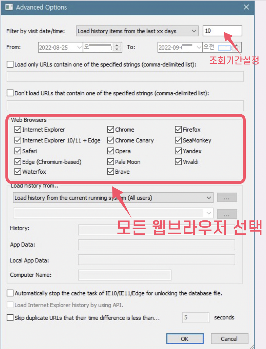 인터넷 익스플로러 뿐만 아니라 크롬, 외에도 파이어폭스, 오페라, 사파리 등 모든 사이트 접속기록을 한 번에 볼 수 있습니다.