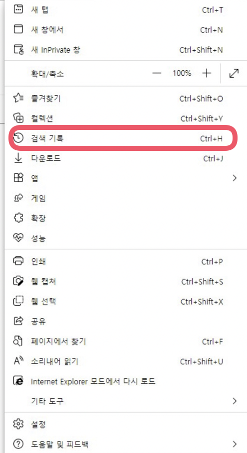 오른쪽 상단의 메뉴에서 검색 기록을 클릭하면 됩니다.
