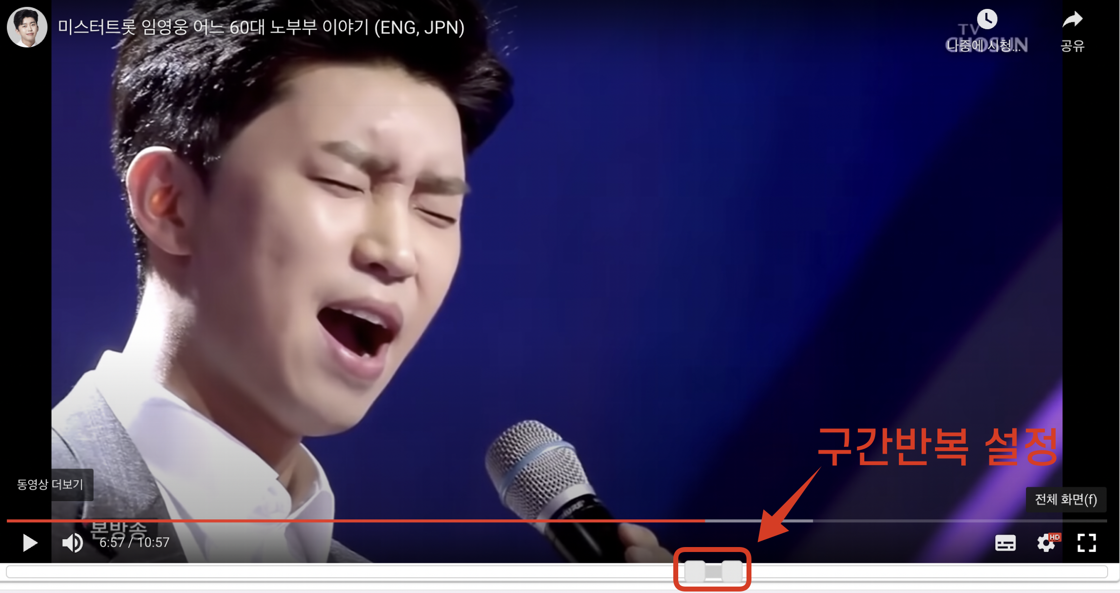 예를 들어 아래 임영웅 노래의 중간 클라이맥스 부분을 반복해보겠습니다.