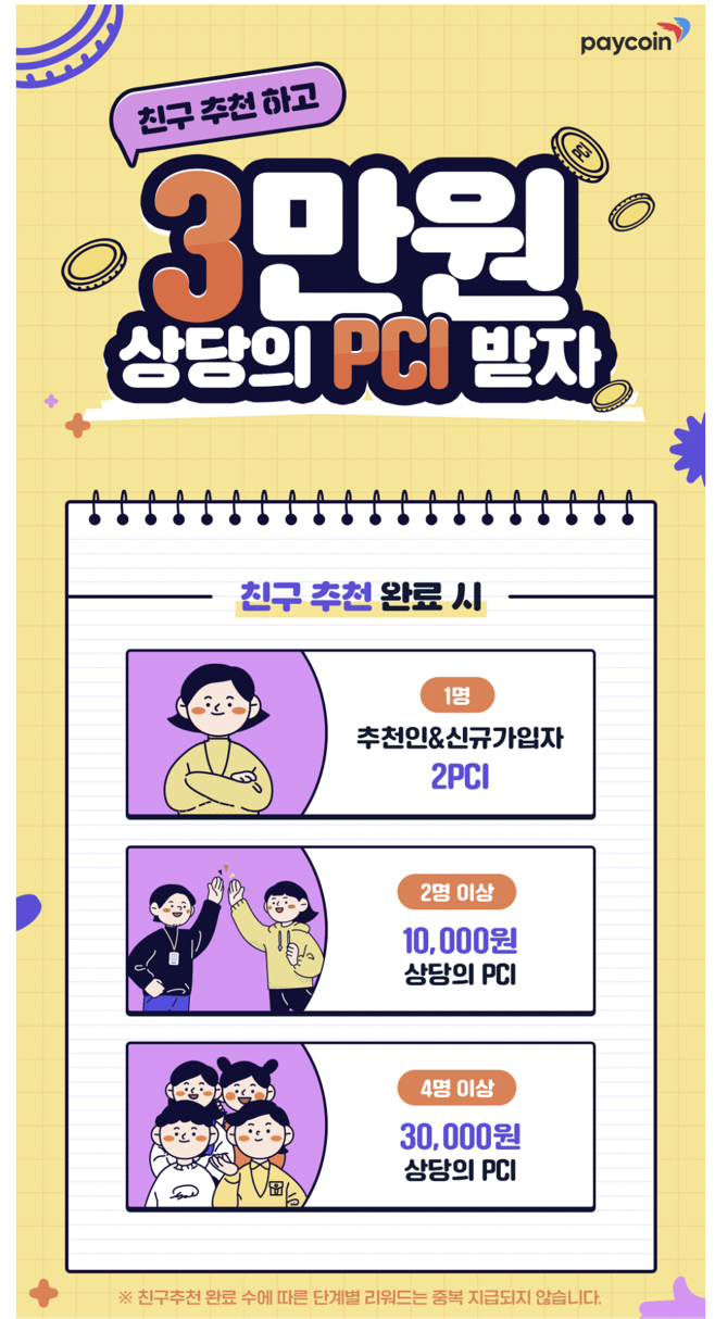 4명 이상을 추천하면 30,000만 원 상당의 PCI를 지급합니다.