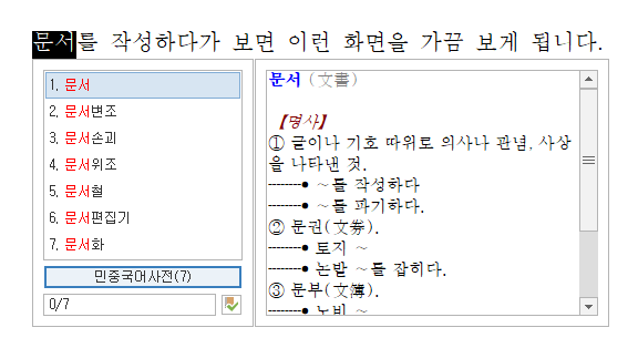 이렇게 블록을 지정할 때마다 사전이 나와서 문서 작성하는데 시간이 지연되는 경우가 있습니다.