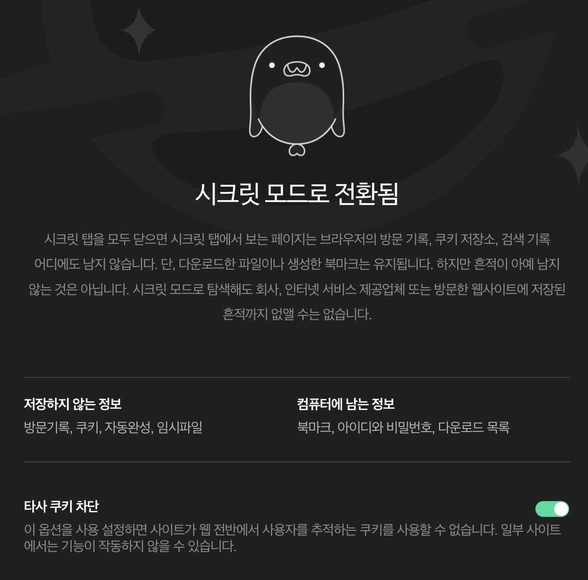 위와 같이 시크릿 모드로 전환된 모습을 볼 수 있습니다.
