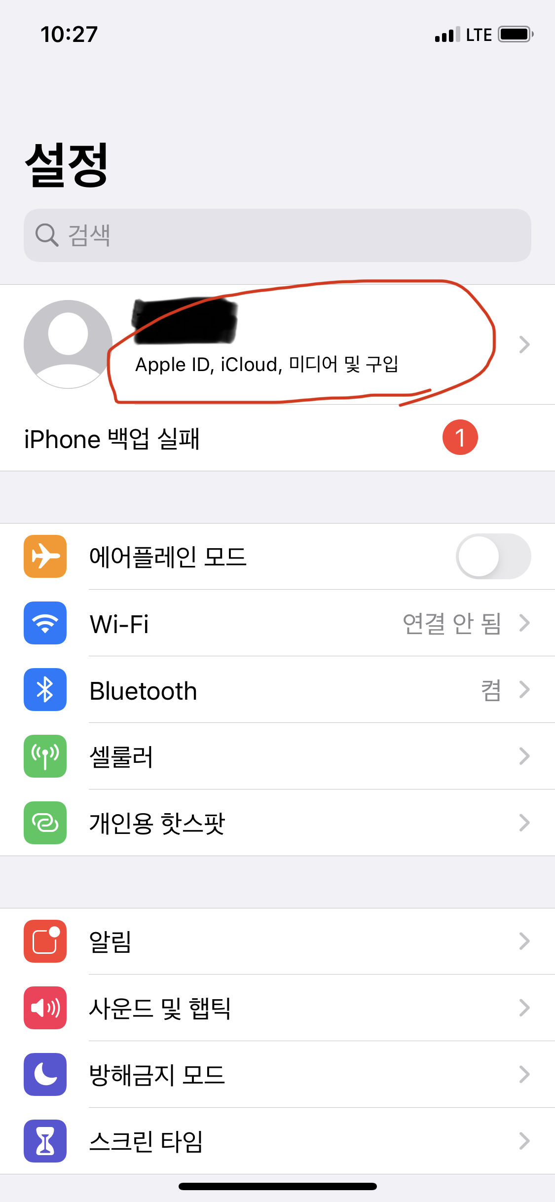 설정에서 맨 위 자신의 이름을 선택합니다.