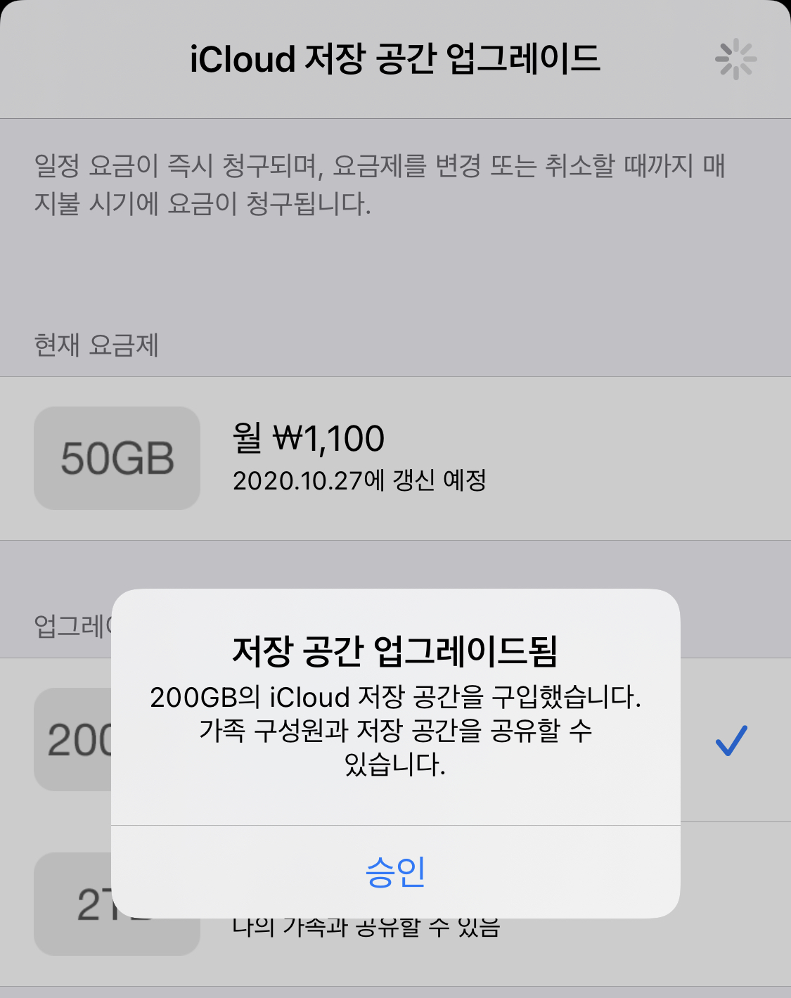 이렇게 아이클라우드 공간 업그레이드는 완료가 됩니다.