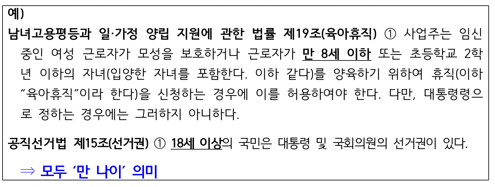예를 들어 공직선거법에서 18세 이상은 선거권이 있다고 할 때, 18세 이상은 만 18세를 의미하는 것이 됩니다.