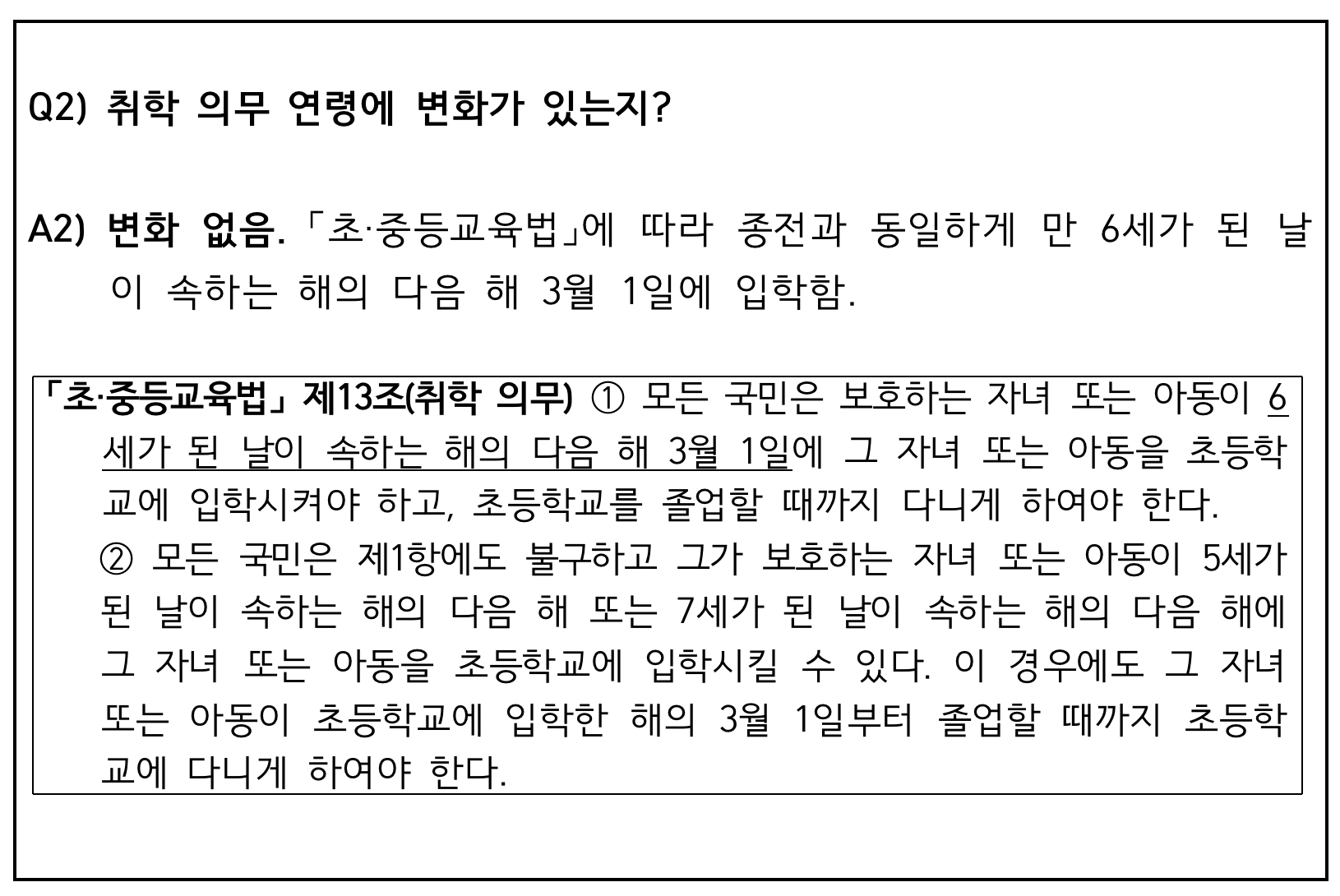 그래서 찾아봤더니 취학 의무 연령은 만 6세가 지난 후 다음 해 3월 1일에 입학하기 때문에 입학은 지금과 동일하고,