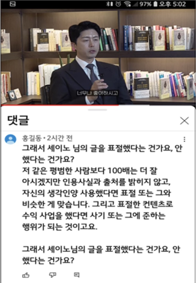 저 같은 평범한 사람보다 100배는 더 잘 아시겠지만 인용사실과 출처를 밝히지 않고, 자신의 생각인 양 사용했다면 표절 또는 그와 비슷한 게 맞습니다. 그리고 표절한 컨텐츠로 수익 사업을 했다면 사기 또는 그에 준하는 행위가 되는 것이고요. 그래서 세이노님의 글을 표절했다는 건가요, 안 했다는 건가요?