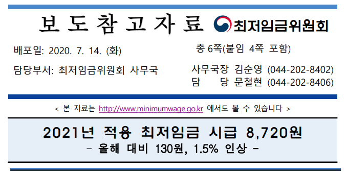 2021년 최저 임금은 2020년 7월 14일 최저임금위원회에서 결정했습니다.