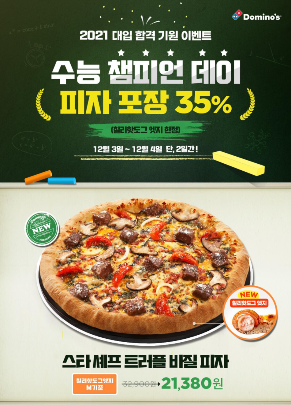 차라리 도미노피자 칠리핫도그 피자 35% 할인은 3만 원짜리 2만 원에 할인해주는 것이라 그나마 이 혜택이 좋은 것 같습니다.