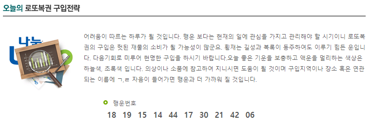 오늘 로또 구입을 자제해야 합니다. 오히려 다툼과 손실 위험이 큰 날입니다. 07(월)행운도가 비교적 좋은 날입니다. 규모는 크지 않지만 구입운도 좋은 날이네요. 08(화)주변의 의견을 참조하세요. 도움을 받는 날이니 의견을 물어 구입하시면 좋습니다. 09(수)무난한 흐름이어서 횡재를 얻을 만한 운은 요소는 없습니다. 10(목)재미 삼아 구입하는 정도여야 합니다. 큰 당첨과는 거리가 있습니다. 11(금)재정적인 손실이 있는 날입니다. 복권구입 외에 다른 곳에서도 재물이 낭비되지 않도록 주의하시기 바랍니다. 12(토)당첨과 거리가 먼 날입니다. 오히려 실수가 많고 운의 흐름이 좋지 않은 하루입니다.