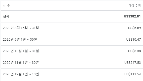 8월 15일부터 애드센스 광고 게재를 시작하고 월별 수익은 아래와 같습니다. 그러고 보니 첫 광고 제한을 10월 9일 금요일 한글날에 받았습니다. 10월 22일 목요일까지 13일간 노출 제한되다가  23일 금요일부터 조금씩 광고가 다시 붙기 시작했었습니다.