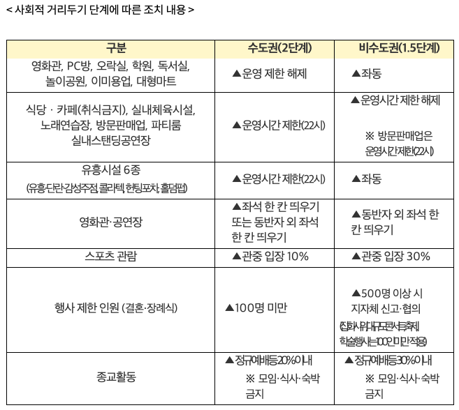 단계 조정에 따라 수도권의 학원, 독서실, 극장 등 업종(약 48만 개소)과 비수도권의 식당, 카페, 실내체육시설 등의 운영시간제한은 해제됩니다. 또한, 수도권의 경우 식당 카페, 실내체육시설, 노래방, 방판, 파티룸 등 21시 운영 제한 업종이 22시까지 운영할 수 있게 되었습니다.