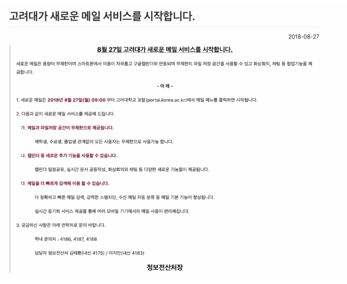 나는 대학 졸업해서 안되겠네 하신 분들은 대학 홈페이지를 통해서 문의를 남겨보세요. 학부생 때 쓰던 메일을 계속 쓰면서 G-suite for Education 계정을 추가로 발급받아 이용할 수도 있다고 합니다.