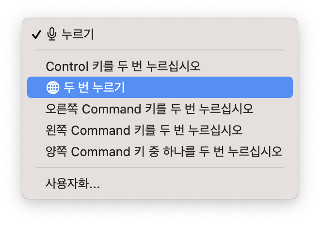 단축키로 설정을 해둡니다. 저는 지구본 두번 누르기를 선택했습니다.