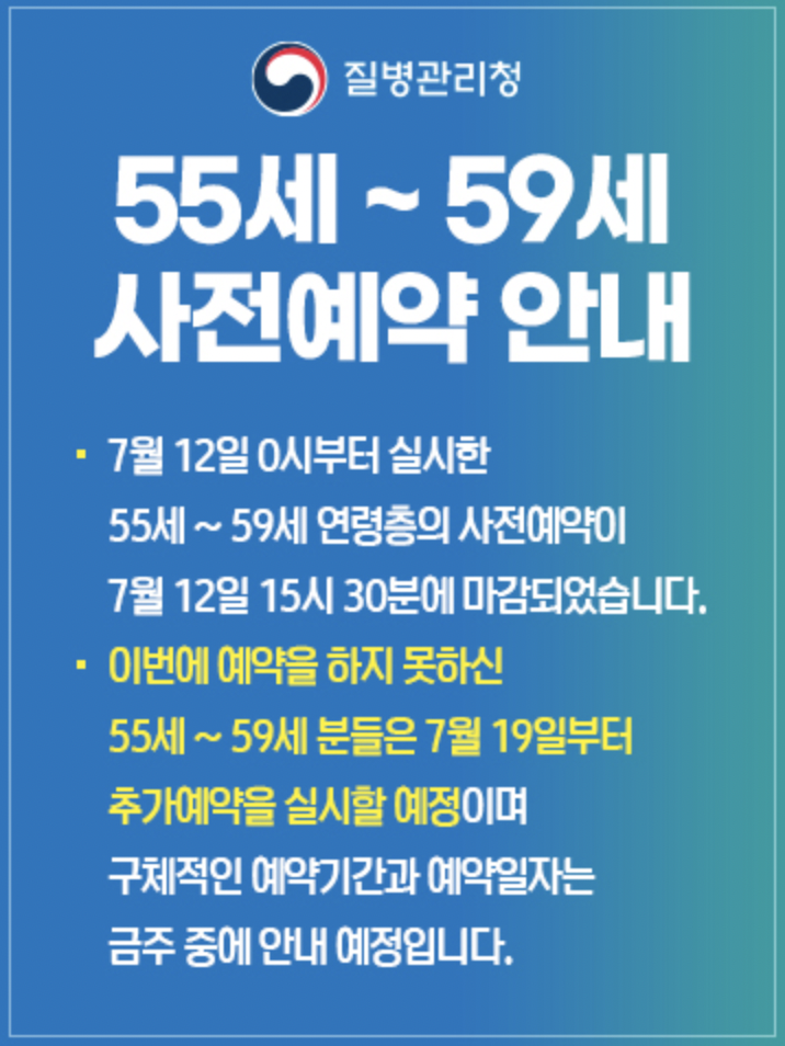- 7. 12일 0시부터 실시한 55세~59세 연령층의 사전예약이 7. 12일 15:30분에 마감되었습니다.
