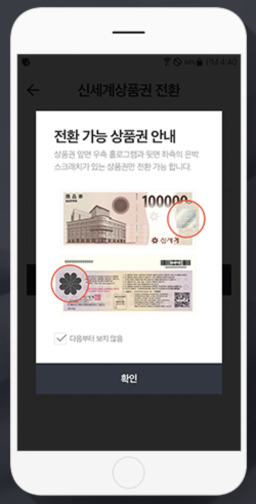 충전할 수 있는 상품권은 스크래치형만 가능합니다. 만약에 금박을 벗겨 사용할 수 있는 스크래치형 상품권이 아닌경우 스크래치형으로 교환이 가능합니다.